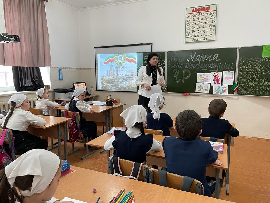 19.03.202219 марта 2022 года классный руководитель 2 «Б» класса Баймурзаева Д.М. провела классный час: «День конституции Чеченской республики» с целью ознакомить с историей Конституции ЧР; дать представления о правах ребёнка; объяснить детям, что такое «право»; формировать представления о правах и обязанностях школьника.