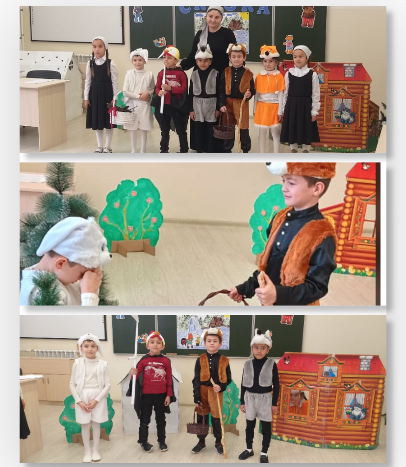 18.01.202418.01.24г года в рамках недели начальных классов учащиеся 1 В класса показали сказку «Лиса и Заяц » Цели и задачи: пробудить интерес к театральной деятельности. Развивать умения следить за развивающим сюжетом произведения, имитировать голосом и голосом характерные действия персонажа; развивать речь, мышление, воображение, четко выполнять действия; совершенствовать умение передавать эмоциональное состояние героев мимикой, жестом, движением; воспитание коллективизма, усидчивости, активности, умения работать в команде, уверенности, смелости; развитие коммуникативных и толерантных способностей, желания принимать участие в общем деле, приносить радость близким людях (своим сверстникам, педагогам). Конспект составлен в соответствии с задачами основной общеобразовательной программы, соответствующими данному возрасту детей. В ходе инсценировки были использованы костюмы для героев сказки и декорации (печь, стол с самоваром, домик) - всё было эстетично оформлено. Пространство использовалось рационально. На занятии использовалась музыка, которая усиливала эмоциональное восприятие. Организационный прием "Приветствие" в стихотворной форме" был направлен на развитие коммуникативных качеств, установлению дружеских взаимоотношений как внутри детского коллектива, так между гостями и детьми. Дети-артисты активно и с желанием сыграли свою выбранную роль сказочного персонажа с помощью взрослого, согласовывая действия с другими героями сказки. Дети-зрители старались быть доброжелательными, внимательными, следили за ходом развития событий в сказке. Процесс театрализованной игры способствовал эмоциональному развитию: дети познакомились с чувствами, настроениями сказочных героев; освоили способы их внешнего выражения, осознали причины того или иного настроя. Классный руководитель: Хасаева А. А