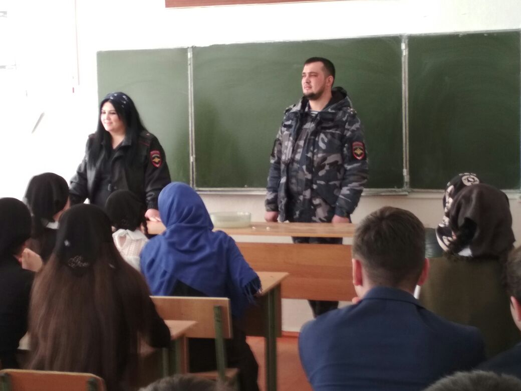 06.03.2018Целью очередной встречи 06.03.2018г. учащихся 10-11 классов МБОУ «Брагунская средняя школа» со старшим инспектором по ПДН по Гудермесскому району, майору полиции Карамурзиной М.Н., было информирование учащихся о состоянии преступности и правонарушений среди несовершеннолетних по Гудермесскому району за 2017 год, о соблюдении правил поведения в общественных местах, об ответственности несовершеннолетних за распитие спиртных напитков, употребление наркотиков и психоактивных веществ. В беседе с подростками она напомнила о комендантском часе, о том, что после 22.00 часов учащиеся школы не могут находиться на улице без сопровождения взрослых.