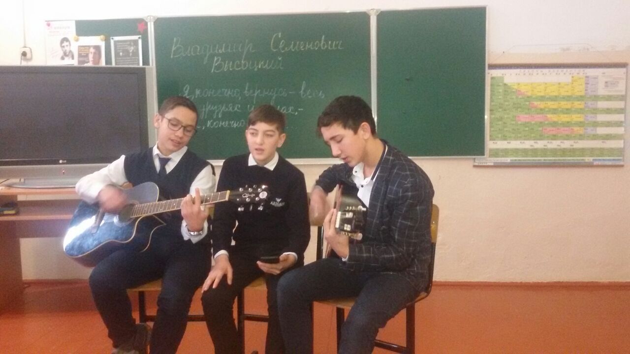 Библиотекарь школы познакомила гостей с интересными фактами из жизни Владимира Семёновича, рассказала о непростой творческой судьбе поэта, а выставка книг и грампластинок ярко представила все грани творчества Высоцкого. Ну, а в завершении своего выступления учащиеся 9-ых классов под гитару исполнили песню «Баллада о борьбе», что стало сюрпризом для собравшихся.